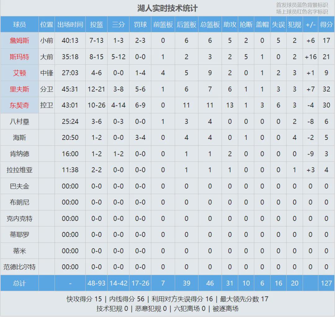 半场战罢,湖人61-50领先11分。艾顿上半场1中0,怒砍1分4篮板2失误。除了艾顿之外,湖人其余四个首发合砍52分。东契奇16分6板8助、詹姆斯13分2板2助2断、里夫斯12分2板1助;约基奇12分7板4助2断、约翰逊9分3板。